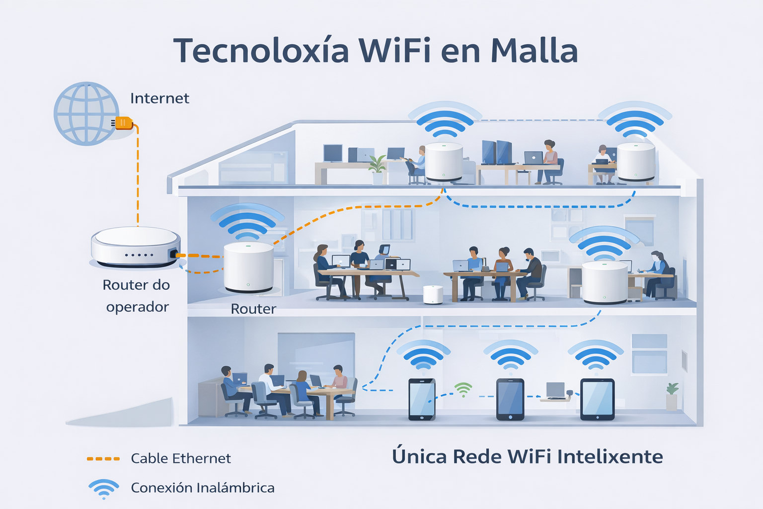 Os dispositivos conéctanse automaticamente ao punto que ofrece mellor sinal en cada momento e cambian dun nodo a outro sen interrupcións. Isto resulta especialmente útil en oficinas, locais comerciais ou espazos con varias plantas nos que o persoal se despraza continuamente con portátiles, móbiles ou tablets.